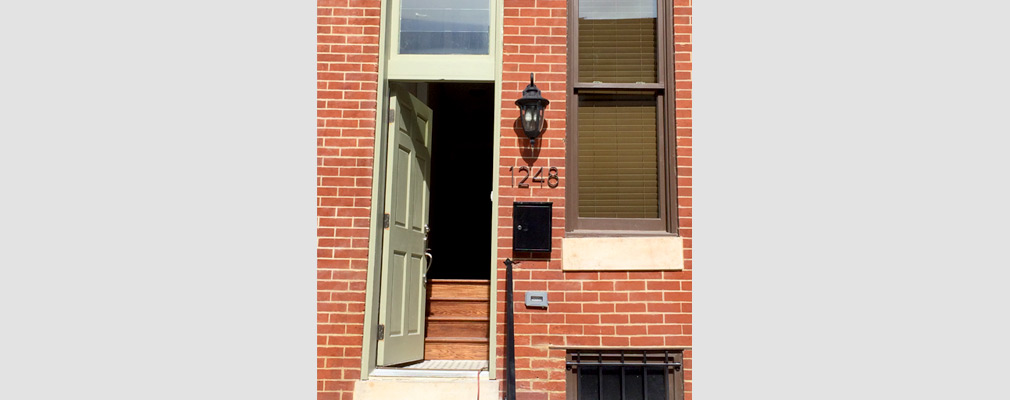 Photograph of the front of a blighted rowhouse with boarded-up windows, an empty doorframe, and debris in the doorway.