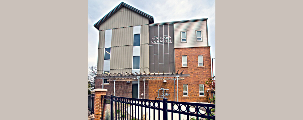 Highland Commons includes 50 one-bedroom apartments in a building that was designed with the housing and supportive service needs of the residents in mind. Each unit is fully equipped with a kitchen, bathroom, and bedroom to allow for independent living and privacy, while the building provides numerous other amenities to support resident health and development. Residents have access to a fitness center, a community room with a kitchen, and a computer lab with Internet access as well as an outdoor patio and vegetable garden. The individual units receive generous amounts of natural sunlight, and the interior paint colors were selected for their calming effect on individuals who are especially sensitive to stress.