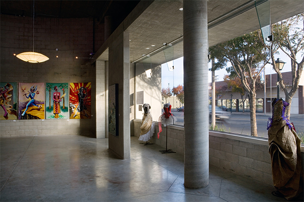 The first-floor commercial space was used to exhibit art work shortly after the building opened (courtesy of Kelly Barrie, Panic Studio LA).